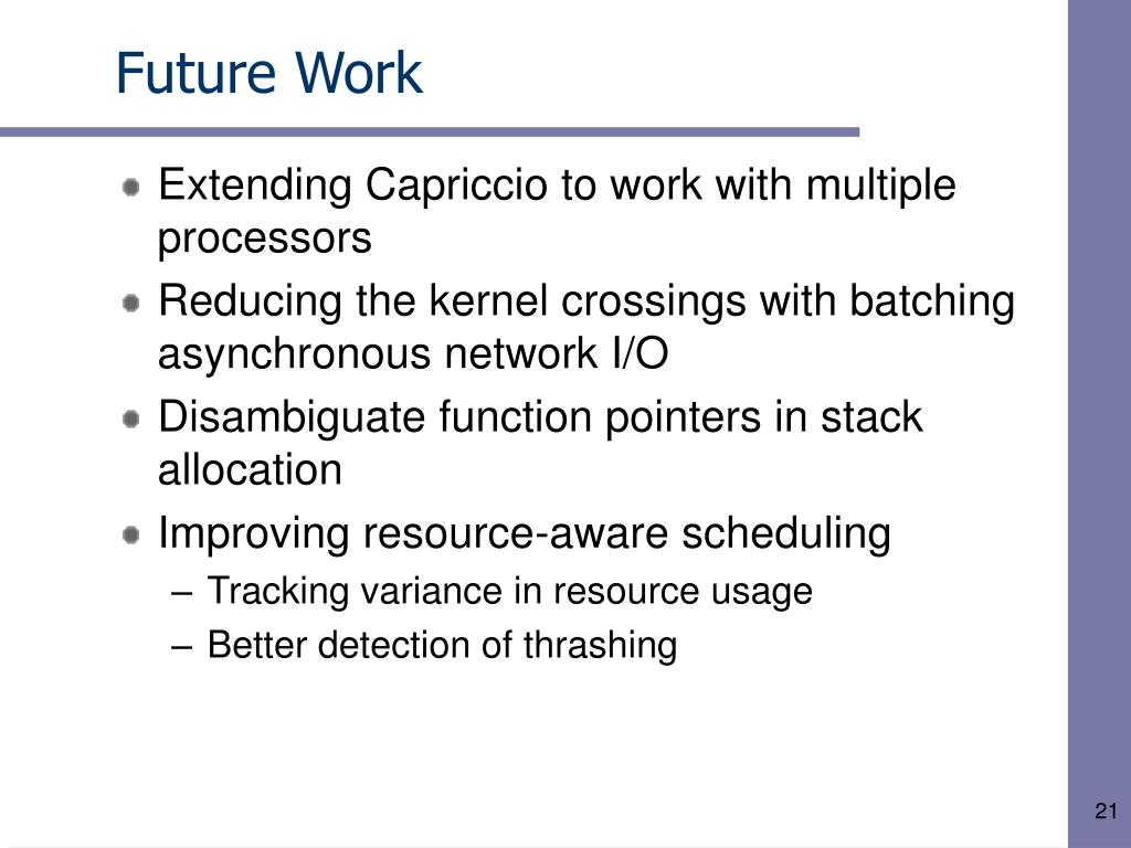 Future Work • Extending Capriccio to work with multiple processors • Reducing the kernel crossings with batching asynchronous network I/O • Disambiguate function pointers in stack allocation • Improving resource-aware scheduling • Tracking variance in resource usage • Better detection of thrashing