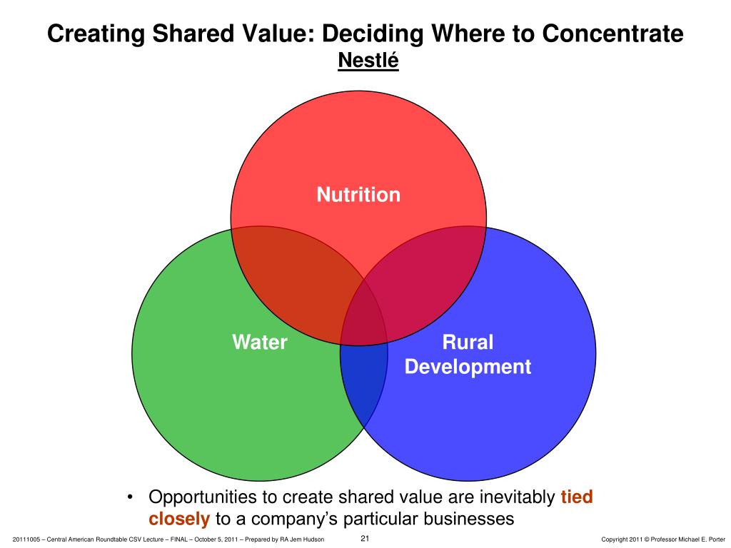 Creating Shared Value: Deciding Where to ConcentrateNestlé Nutrition Water Rural Development • Opportunities to create shared value are inevitablytiedcloselyto a company’s particular businesses