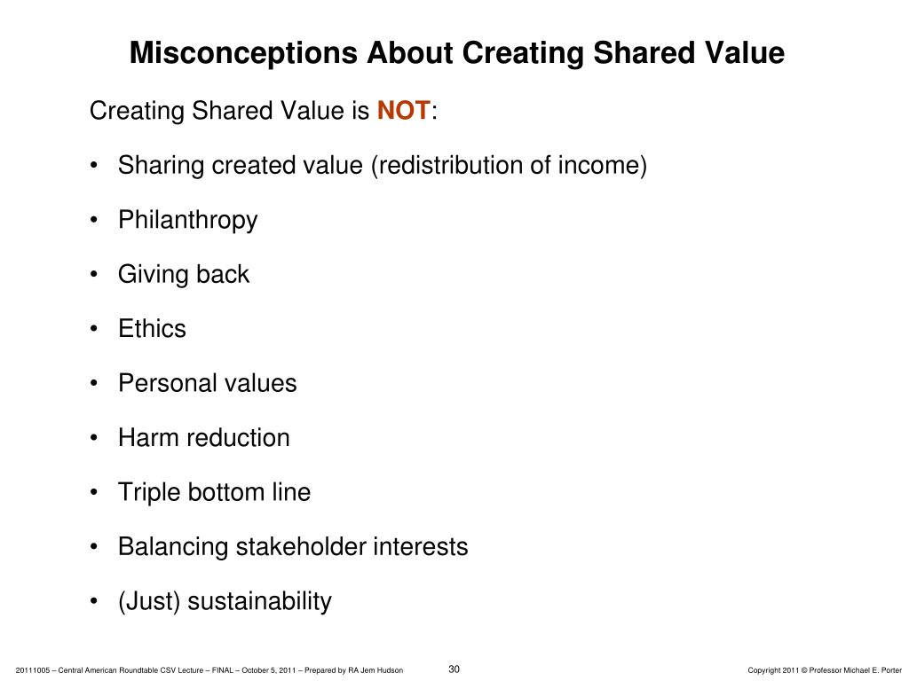 Misconceptions About Creating Shared Value Creating Shared Value is NOT: • Sharing created value (redistribution of income) • Philanthropy • Giving back • Ethics • Personal values • Harm reduction • Triple bottom line • Balancing stakeholder interests • (Just) sustainability