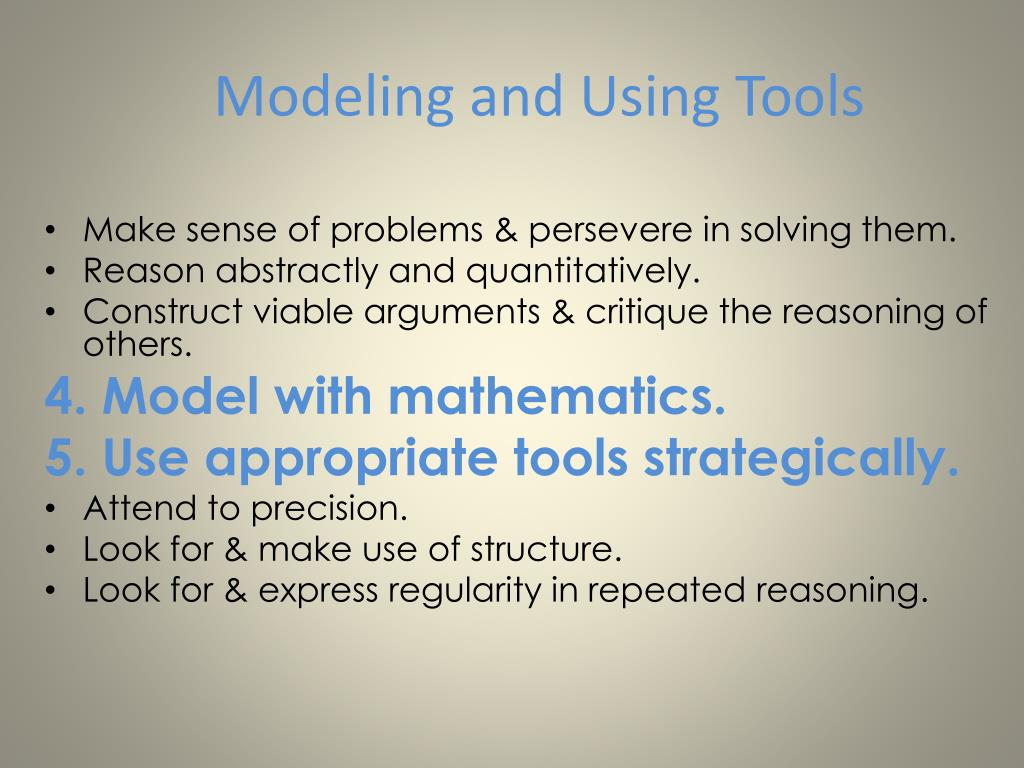 Modeling and Using Tools • Make sense of problems & persevere in solving them. • Reason abstractly and quantitatively. • Construct viable arguments & critique the reasoning of others. 4. Model with mathematics. 5. Use appropriate tools strategically. • Attend to precision. • Look for & make use of structure. • Look for & express regularity in repeated reasoning.