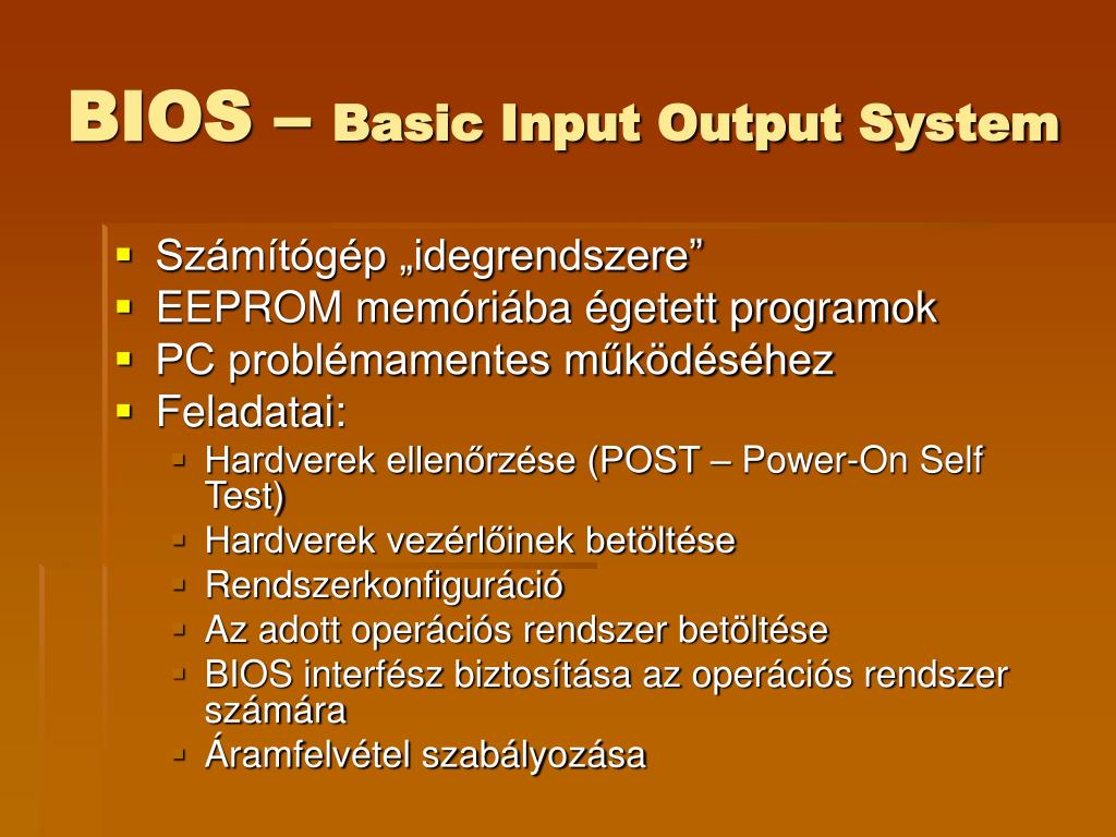 BIOS – Basic Input Output System • Számítógép „idegrendszere” • EEPROM memóriába égetett programok • PC problémamentes működéséhez • Feladatai: • Hardverek ellenőrzése (POST – Power-On Self Test) • Hardverek vezérlőinek betöltése • Rendszerkonfiguráció • Az adott operációs rendszer betöltése • BIOS interfész biztosítása az operációs rendszer számára • Áramfelvétel szabályozása