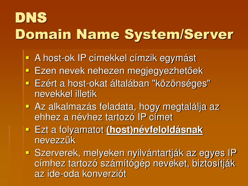 DNS Domain Name System/Server • A host-ok IP címekkel címzik egymást • Ezen nevek nehezen megjegyezhetőek • Ezért a host-okat általában "közönséges" nevekkel illetik • Az alkalmazás feladata, hogy megtalálja az ehhez a névhez tartozó IP címet • Ezt a folyamatot (host)névfeloldásnak nevezzük • Szerverek, melyeken nyilvántartják az egyes IP címhez tartozó számítógép neveket, biztosítják az ide-oda konverziót