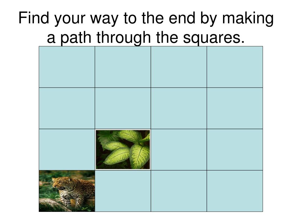 Find your way to the end by making a path through the squares. Start (click here, then continue)