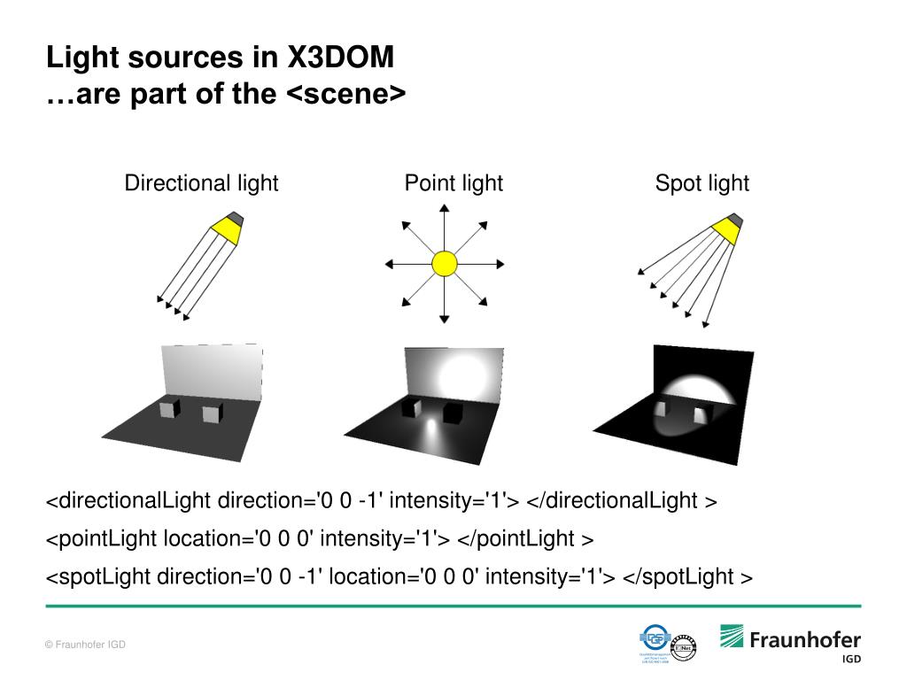 Light sources in X3DOM…are part of the <scene> <directionalLight direction='0 0 -1' intensity='1'> </directionalLight > <pointLight location='0 0 0' intensity='1'> </pointLight > <spotLight direction='0 0 -1' location='0 0 0' intensity='1'> </spotLight > Directionallight Point light Spot light