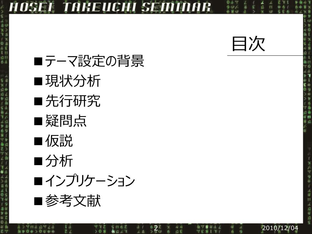 目次 2 2010/12/04 ■テーマ設定の背景 ■現状分析 ■先行研究 ■疑問点 ■仮説 ■分析 ■インプリケーション ■参考文献