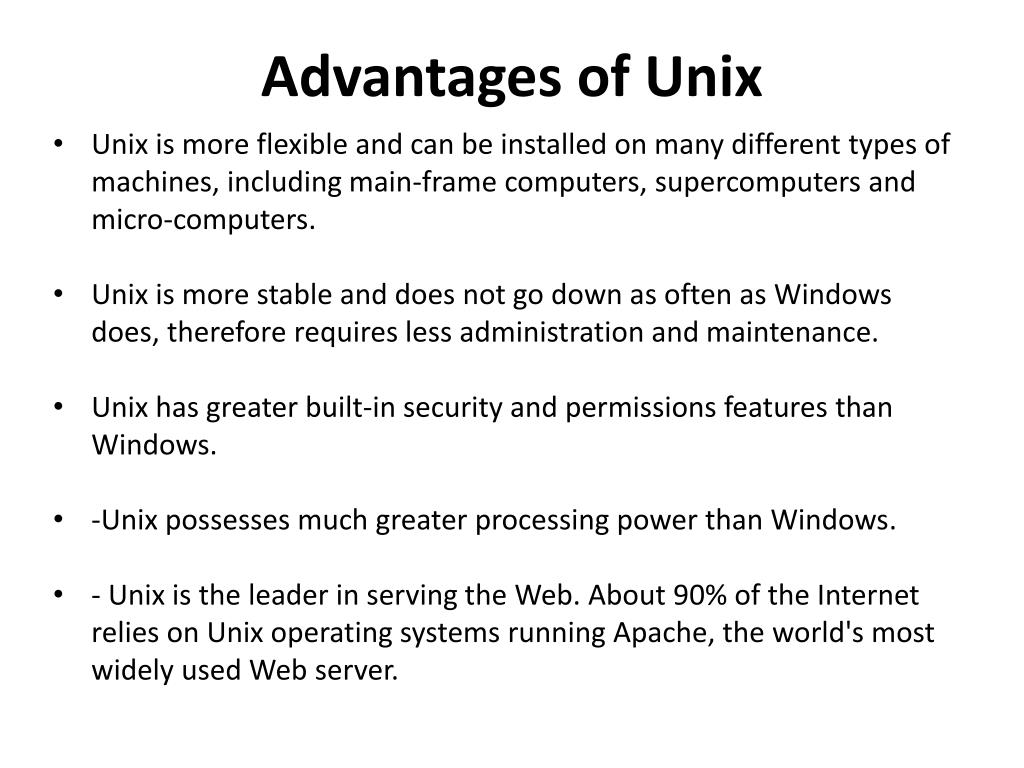 Advantages of Unix • Unix is more flexible and can be installed on many different types of machines, including main-frame computers, supercomputers and micro-computers. • Unix is more stable and does not go down as often as Windows does, therefore requires less administration and maintenance. • Unix has greater built-in security and permissions features than Windows. • -Unix possesses much greater processing power than Windows. • - Unix is the leader in serving the Web. About 90% of the Internet relies on Unix operating systems running Apache, the world's most widely used Web server.