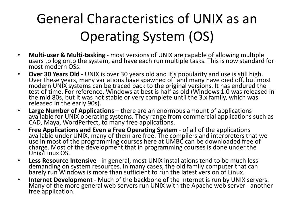 General Characteristics of UNIX as an Operating System (OS) • Multi-user & Multi-tasking - most versions of UNIX are capable of allowing multiple users to log onto the system, and have each run multiple tasks. This is now standard for most modern OSs. • Over 30 Years Old - UNIX is over 30 years old and it's popularity and use is still high. Over these years, many variations have spawned off and many have died off, but most modern UNIX systems can be traced back to the original versions. It has endured the test of time. For reference, Windows at best is half as old (Windows 1.0 was released in the mid 80s, but it was not stable or very complete until the 3.x family, which was released in the early 90s). • Large Number of Applications – there are an enormous amount of applications available for UNIX operating systems. They range from commercial applications such as CAD, Maya, WordPerfect, to many free applications. • Free Applications and Even a Free Operating System - of all of the applications available under UNIX, many of them are free. The compilers and interpreters that we use in most of the programming courses here at UMBC can be downloaded free of charge. Most of the development that in programming courses is done under the Unix/Linux OS. • Less Resource Intensive - in general, most UNIX installations tend to be much less demanding on system resources. In many cases, the old family computer that can barely run Windows is more than sufficient to run the latest version of Linux. • Internet Development - Much of the backbone of the Internet is run by UNIX servers. Many of the more general web servers run UNIX with the Apache web server - another free application.