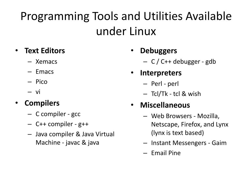 Programming Tools and Utilities Available under Linux • Text Editors • Xemacs • Emacs • Pico • vi • Compilers • C compiler - gcc • C++ compiler - g++ • Java compiler & Java Virtual Machine - javac & java • Debuggers • C / C++ debugger - gdb • Interpreters • Perl - perl • Tcl/Tk - tcl & wish • Miscellaneous • Web Browsers - Mozilla, Netscape, Firefox, and Lynx (lynx is text based) • Instant Messengers - Gaim • Email Pine