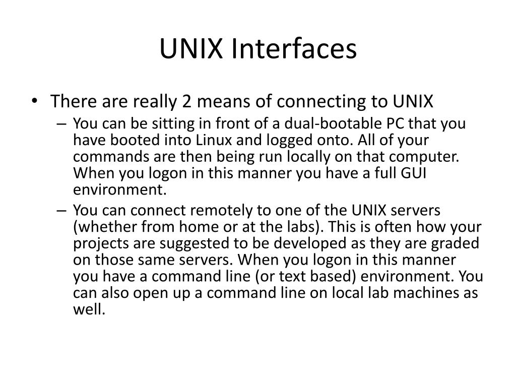 UNIX Interfaces • There are really 2 means of connecting to UNIX • You can be sitting in front of a dual-bootable PC that you have booted into Linux and logged onto. All of your commands are then being run locally on that computer. When you logon in this manner you have a full GUI environment. • You can connect remotely to one of the UNIX servers (whether from home or at the labs). This is often how your projects are suggested to be developed as they are graded on those same servers. When you logon in this manner you have a command line (or text based) environment. You can also open up a command line on local lab machines as well.