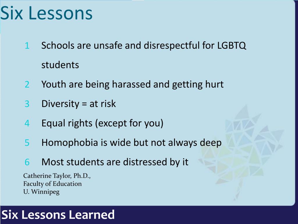 Six Lessons • Schools are unsafe and disrespectful for LGBTQ students • Youth are being harassed and getting hurt • Diversity = at risk • Equal rights (except for you) • Homophobia is wide but not always deep • Most students are distressed by it Catherine Taylor, Ph.D.,Faculty of EducationU. Winnipeg Six Lessons Learned