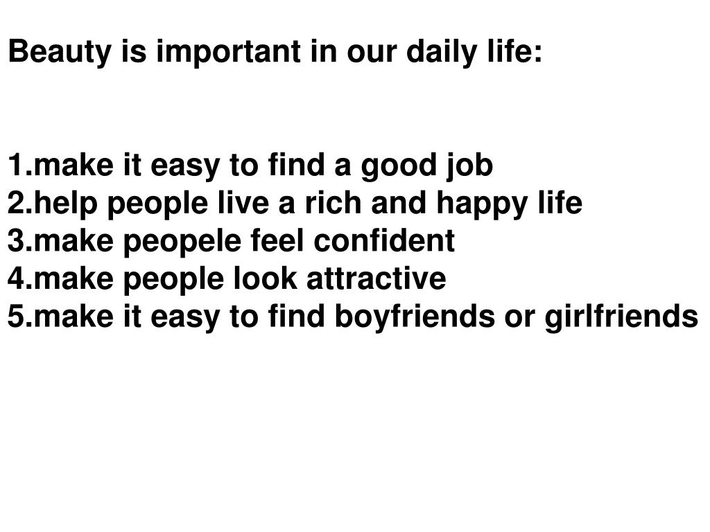 Beauty is important in our daily life: • make it easy to find a good job • help people live a rich and happy life • make peopele feel confident • make people look attractive • make it easy to find boyfriends or girlfriends