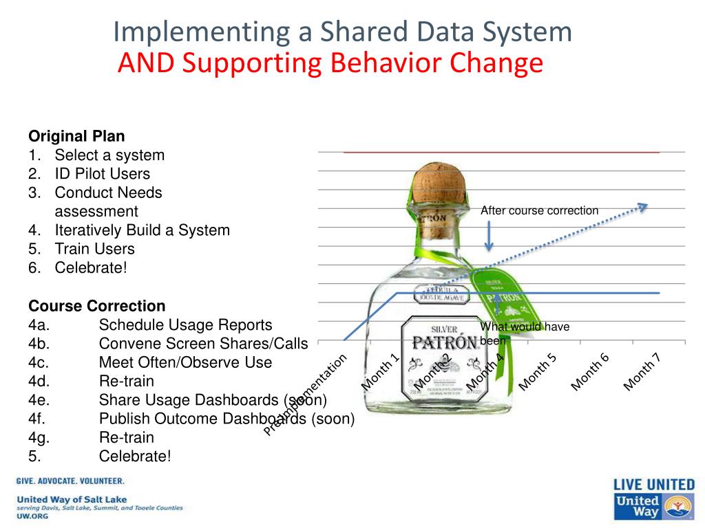 Implementing a Shared Data System AND Supporting Behavior Change AND Supporting Behavior Change After course correction Original Plan Select a system ID Pilot Users Conduct Needs assessment Iteratively Build a System Train Users Celebrate! Course Correction 4a. Schedule Usage Reports 4b. Convene Screen Shares/Calls 4c. Meet Often/Observe Use 4d. Re-train 4e. Share Usage Dashboards (soon) 4f. Publish Outcome Dashboards (soon) 4g. Re-train 5. Celebrate! What would have been