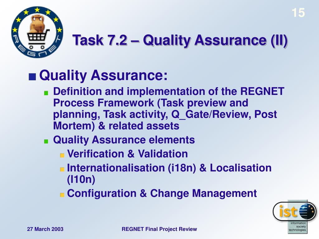 Task 7.2 – Quality Assurance (I) • Project Management • Coordination of Portal and Graphical User Interface efforts • Quality Assurance: definition and support in the implementation of the REGNET Process Framework & related assets and of Quality Assurance elements and practices REGNET Final Project Review
