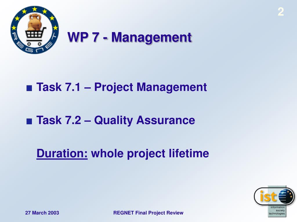 WP 7 - Management • Task 7.1 – Project Management • Task 7.2 – Quality Assurance Duration: whole project lifetime REGNET Final Project Review
