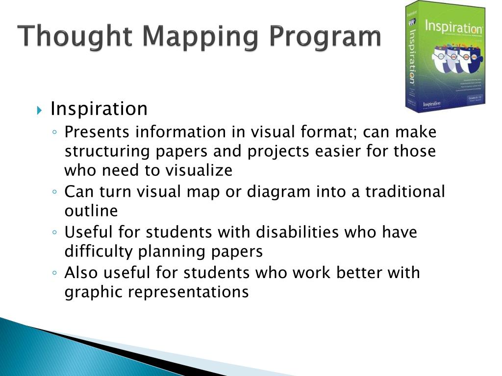 Thought Mapping Program • Inspiration • Presents information in visual format; can make structuring papers and projects easier for those who need to visualize • Can turn visual map or diagram into a traditional outline • Useful for students with disabilities who have difficulty planning papers • Also useful for students who work better with graphic representations