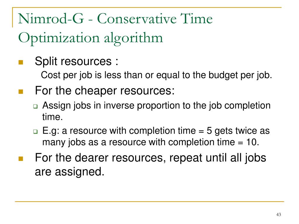 Nimrod-G - Conservative Time Optimization algorithm • Split resources : Cost per job is less than or equal to the budget per job. • For the cheaper resources: • Assign jobs in inverse proportion to the job completion time. • E.g: a resource with completion time = 5 gets twice as many jobs as a resource with completion time = 10. • For the dearer resources, repeat until all jobs are assigned.