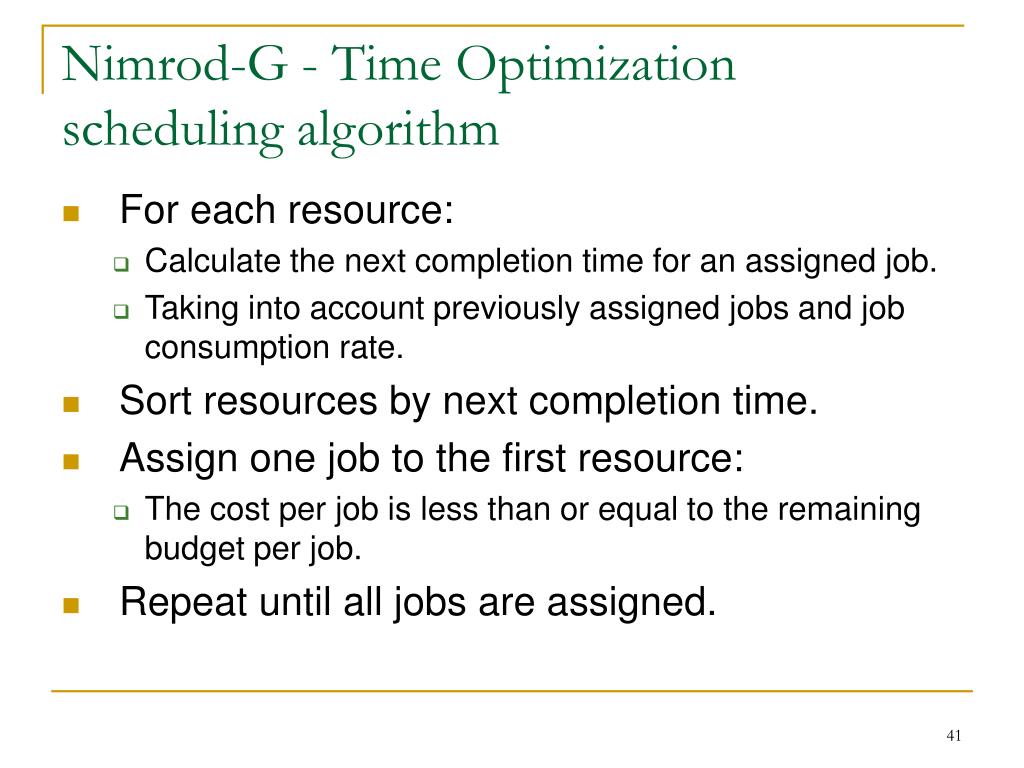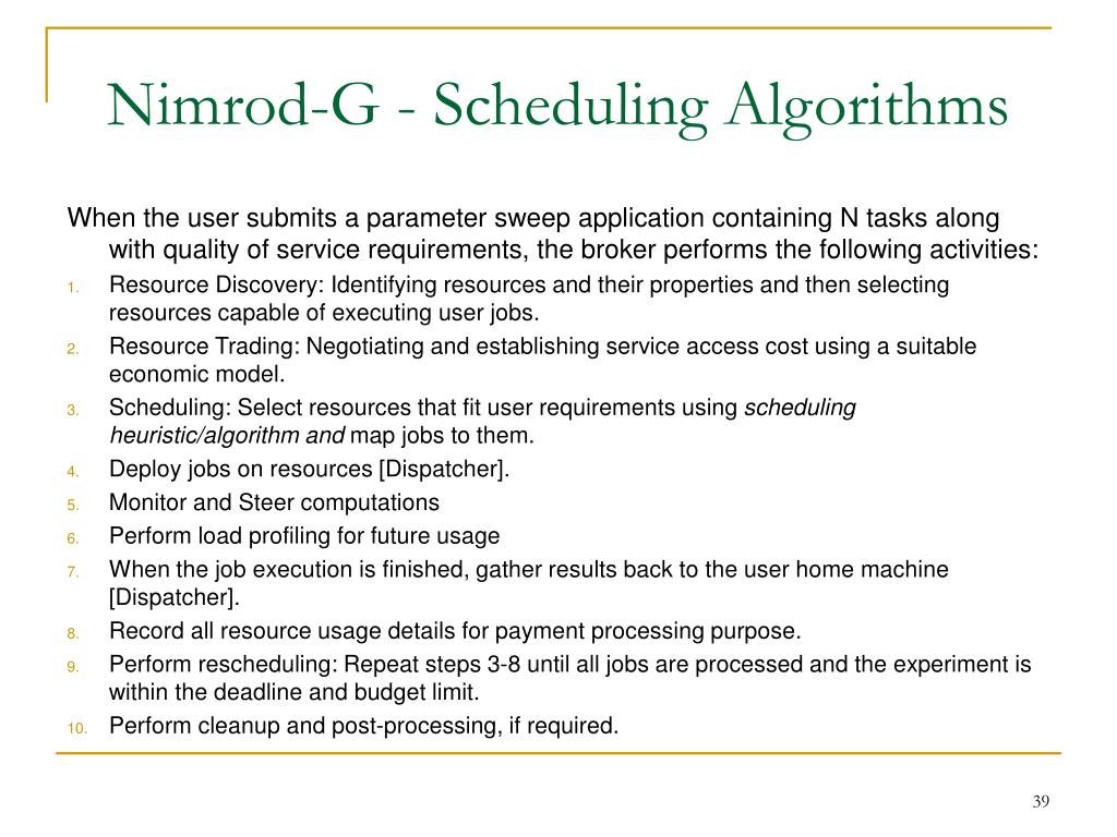 Nimrod-G - Scheduling Algorithms When the user submits a parameter sweep application containing N tasks along with quality of service requirements, the broker performs the following activities: Resource Discovery: Identifying resources and their properties and then selecting resources capable of executing user jobs. Resource Trading: Negotiating and establishing service access cost using a suitable economic model. Scheduling: Select resources that fit user requirements using scheduling heuristic/algorithm and map jobs to them. Deploy jobs on resources [Dispatcher]. Monitor and Steer computations Perform load profiling for future usage When the job execution is finished, gather results back to the user home machine [Dispatcher]. Record all resource usage details for payment processing purpose. Perform rescheduling: Repeat steps 3-8 until all jobs are processed and the experiment is within the deadline and budget limit. Perform cleanup and post-processing, if required.