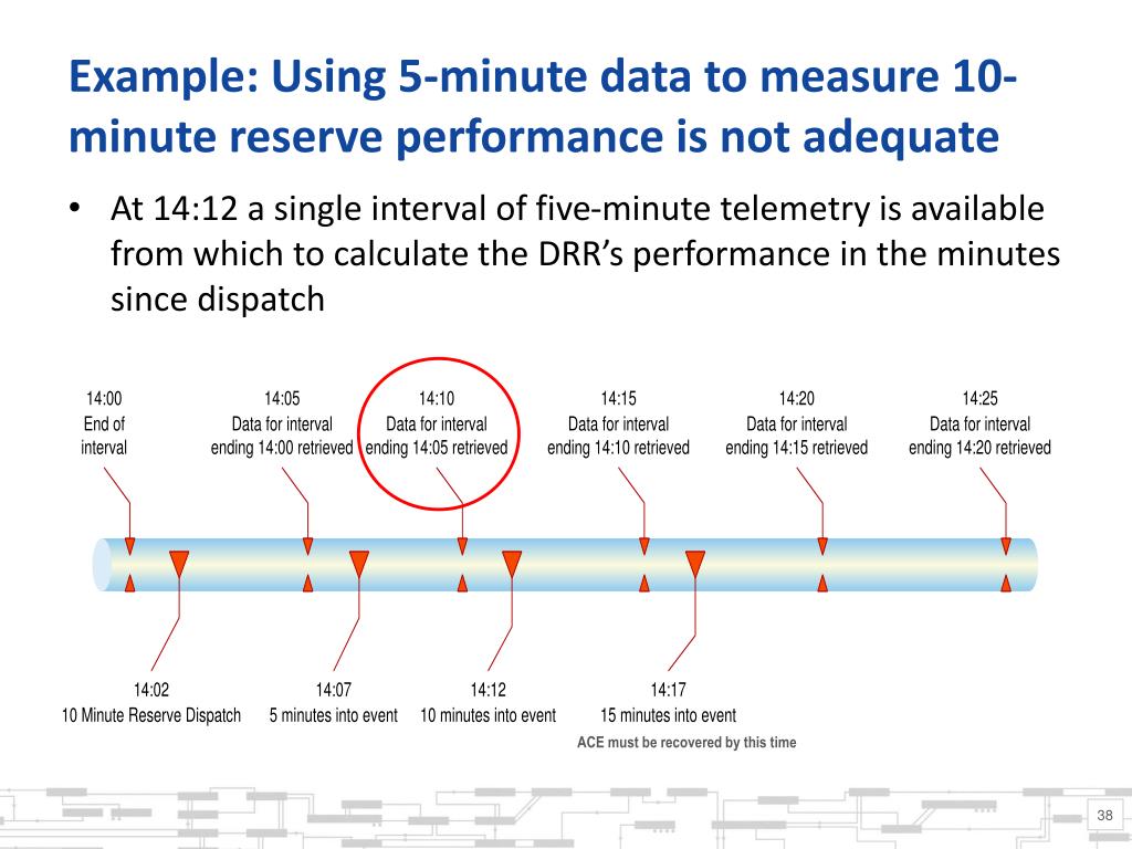Example: Using 5-minute data to measure 10-minute reserve performance is not adequate • At 14:12 a single interval of five-minute telemetry is available from which to calculate the DRR’s performance in the minutes since dispatch ACE must be recovered by this time