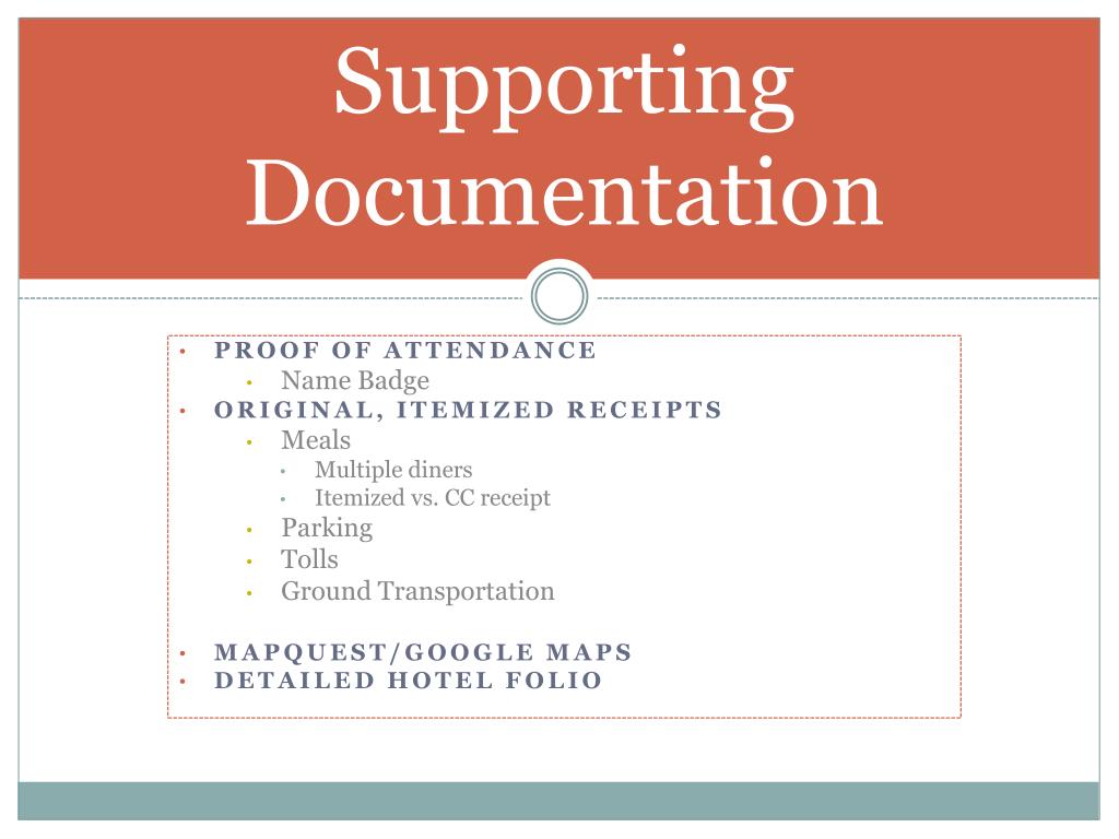 Supporting Documentation Proof of attendance Name Badge Original, itemized receipts Meals Multiple diners Itemized vs. CC receipt Parking Tolls Ground Transportation MapQuest/google maps Detailed hotel folio
