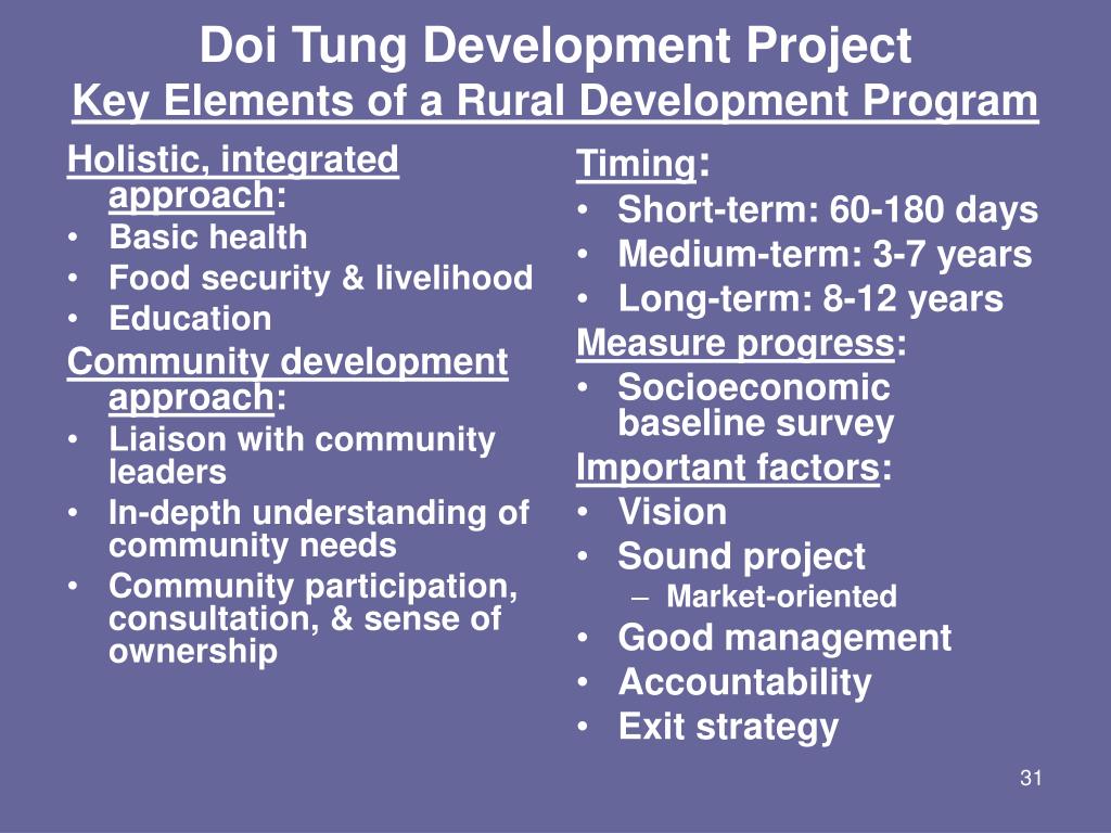 Holistic, integrated approach: Basic health Food security & livelihood Education Community development approach: Liaison with community leaders In-depth understanding of community needs Community participation, consultation, & sense of ownership Timing: Short-term: 60-180 days Medium-term: 3-7 years Long-term: 8-12 years Measure progress: Socioeconomic baseline survey Important factors: Vision Sound project Market-oriented Good management Accountability Exit strategy Doi Tung Development ProjectKey Elements of a Rural Development Program
