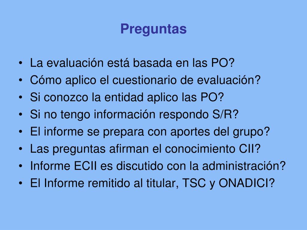 Preguntas • La evaluación está basada en las PO? • Cómo aplico el cuestionario de evaluación? • Si conozco la entidad aplico las PO? • Si no tengo información respondo S/R? • El informe se prepara con aportes del grupo? • Las preguntas afirman el conocimiento CII? • Informe ECII es discutido con la administración? • El Informe remitido al titular, TSC y ONADICI?