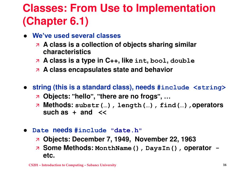 Classes: From Use to Implementation (Chapter 6.1) • We’ve used several classes • A class is a collection of objects sharing similar characteristics • A class is a type in C++, like int, bool, double • A class encapsulates state and behavior • string (this is a standard class), needs#include <string> • Objects: "hello", "there are no frogs", … • Methods: substr(…),length(…),find(…),operators such as + and<< • Date needs#include "date.h" • Objects: December 7, 1949, November 22, 1963 • Some Methods: MonthName(),DaysIn(), operator - etc.