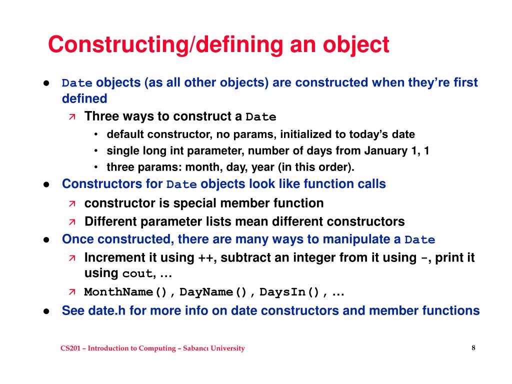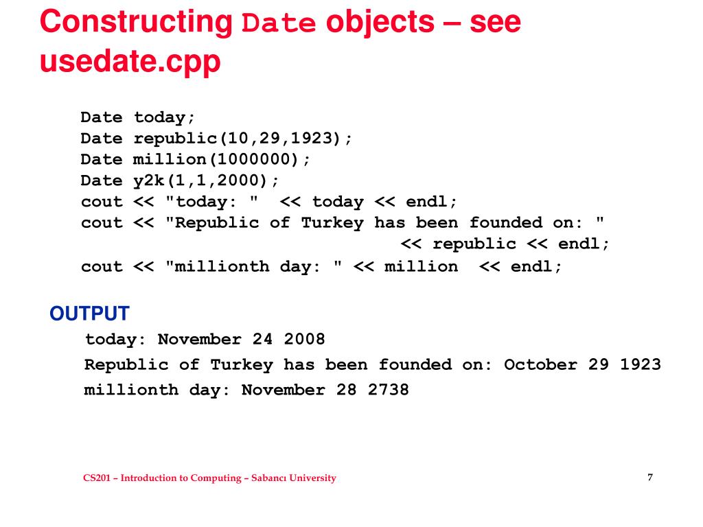 Constructing Date objects – see usedate.cpp Date today; Date republic(10,29,1923); Date million(1000000); Date y2k(1,1,2000); cout << "today: " << today << endl; cout << "Republic of Turkey has been founded on: " << republic << endl; cout << "millionth day: " << million << endl; OUTPUT today: November 24 2008 Republic of Turkey has been founded on: October 29 1923 millionth day: November 28 2738