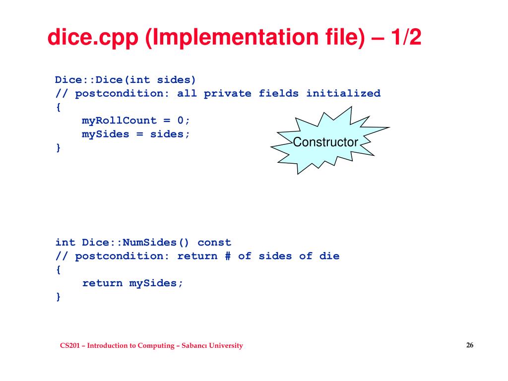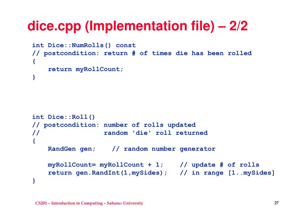 dice.cpp (Implementation file) – 1/2 Dice::Dice(int sides) // postcondition: all private fields initialized { myRollCount = 0; mySides = sides; } int Dice::NumSides() const // postcondition: return # of sides of die { return mySides; } Constructor