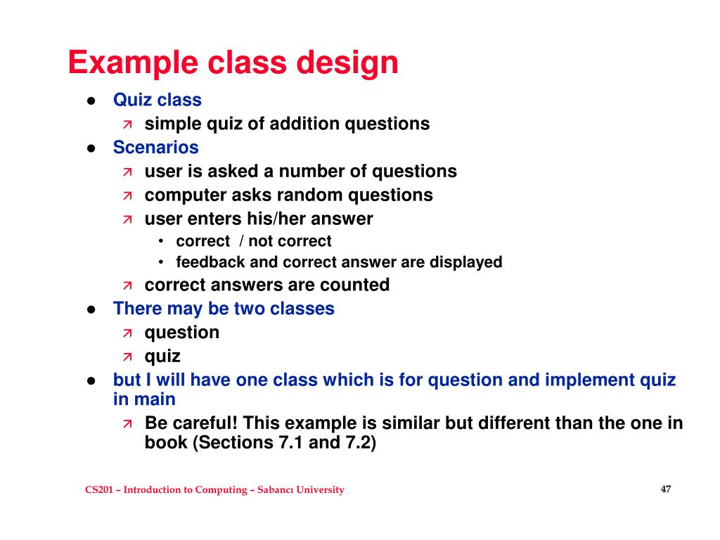 Example class design • Quiz class • simple quiz of addition questions • Scenarios • user is asked a number of questions • computer asks random questions • user enters his/her answer • correct / not correct • feedback and correct answer are displayed • correct answers are counted • There may be two classes • question • quiz • but I will have one class which is for question and implement quiz in main • Be careful! This example is similar but different than the one in book (Sections 7.1 and 7.2)