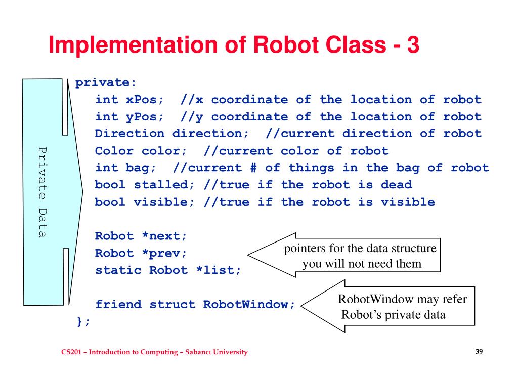 Implementation of Robot Class - 1 • Your next homework will be about updating the Robot class • you will add some member functionsthat requires to deal with robots.h and robots.cpp files (actually in the homework, you will use an updated class for which the file names are robots_modified.h and robots_modified.cpp) • and you use those newly added functions in an application • It is a good idea to have a look at how this class is implemented • It is designed and implemented by Ersin Karabudak • I have made some changes later • Robot class implementation is quite complex • Robot, RobotWindow and RobotWorld are different structures • we will not deal with RobotWindow and RobotWorld, but the implementation file contains robot class implementation and the details of RobotWindow and RobotWorld too. Do not get confused. • Robots are maintained as a circular doubly linked list • it is a data structure that uses pointers (probably will see in CS202) • but do not get thrilled! you will not need those complex structures for the member functions that you will add. • Some details you have to know will be given now and more details will be given in recitations this week
