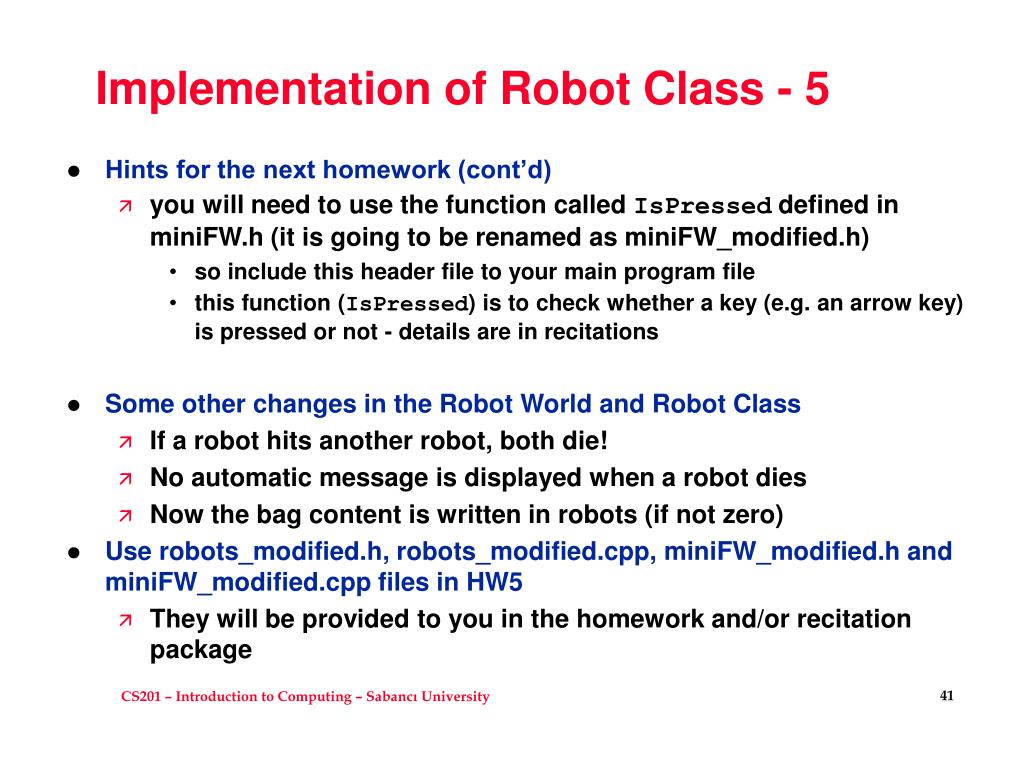 Implementation of Robot Class - 5 • Hints for the next homework (cont’d) • you will need to use the function called IsPressed defined in miniFW.h (it is going to be renamed as miniFW_modified.h) • so include this header file to your main program file • this function (IsPressed) is to check whether a key (e.g. an arrow key) is pressed or not - details are in recitations • Some other changes in the Robot World and Robot Class • If a robot hits another robot, both die! • No automatic message is displayed when a robot dies • Now the bag content is written in robots (if not zero) • Use robots_modified.h, robots_modified.cpp, miniFW_modified.h and miniFW_modified.cpp files in HW5 • They will be provided to you in the homework and/or recitation package