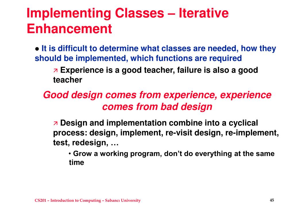 Implementing Classes – Iterative Enhancement • It is difficult to determine what classes are needed, how they should be implemented, which functions are required • Experience is a good teacher, failure is also a good teacher Good design comes from experience, experience comes from bad design • Design and implementation combine into a cyclical process: design, implement, re-visit design, re-implement, test, redesign, … • Grow a working program, don’t do everything at the same time