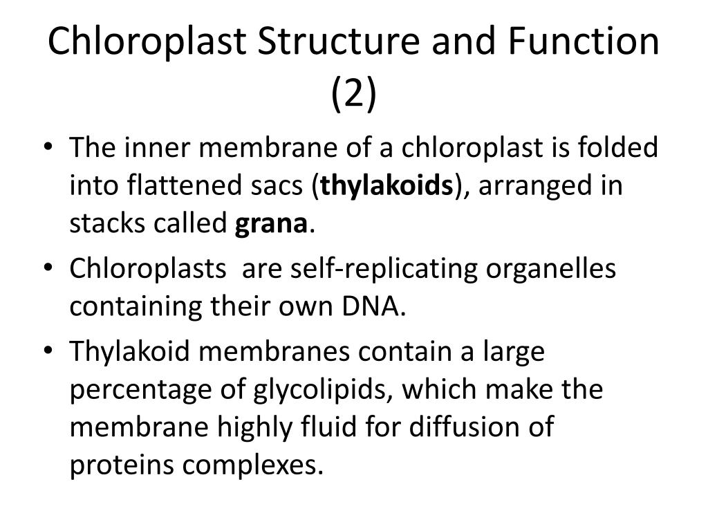 Chloroplast Structure and Function (2) • The inner membrane of a chloroplast is folded into flattened sacs (thylakoids), arranged in stacks called grana. • Chloroplasts are self-replicating organelles containing their own DNA. • Thylakoid membranes contain a large percentage of glycolipids, which make the membrane highly fluid for diffusion of proteins complexes.
