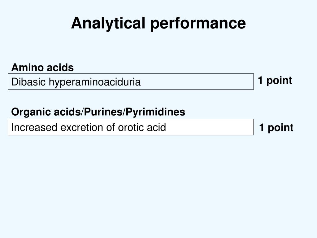 Analytical performance 1 point Amino acids Dibasic hyperaminoaciduria Organic acids/Purines/Pyrimidines Increased excretion of orotic acid 1 point