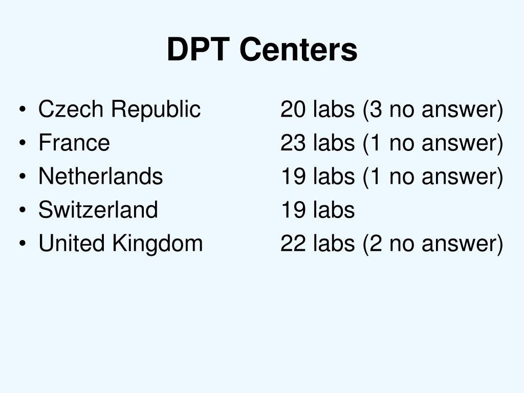 DPT Centers • Czech Republic 20 labs (3 no answer) • France 23 labs (1 no answer) • Netherlands 19 labs (1 no answer) • Switzerland 19 labs • United Kingdom 22 labs (2 no answer)