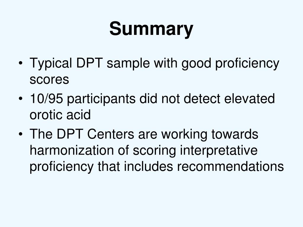 Summary • Typical DPT sample with good proficiency scores • 10/95 participants did not detect elevated orotic acid • The DPT Centers are working towards harmonization of scoring interpretative proficiency that includes recommendations