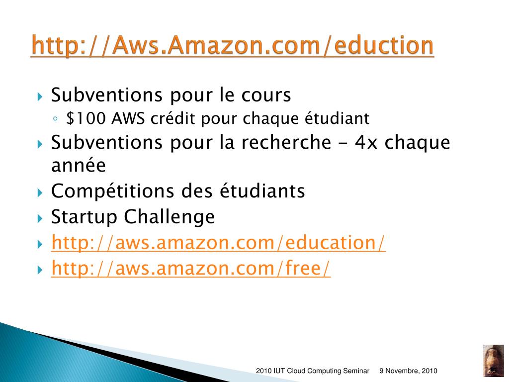 http://Aws.Amazon.com/eduction • Subventions pour le cours • $100 AWS crédit pour chaque étudiant • Subventions pour la recherche - 4x chaque année • Compétitions des étudiants • Startup Challenge • http://aws.amazon.com/education/ • http://aws.amazon.com/free/ 2010 IUT Cloud Computing Seminar