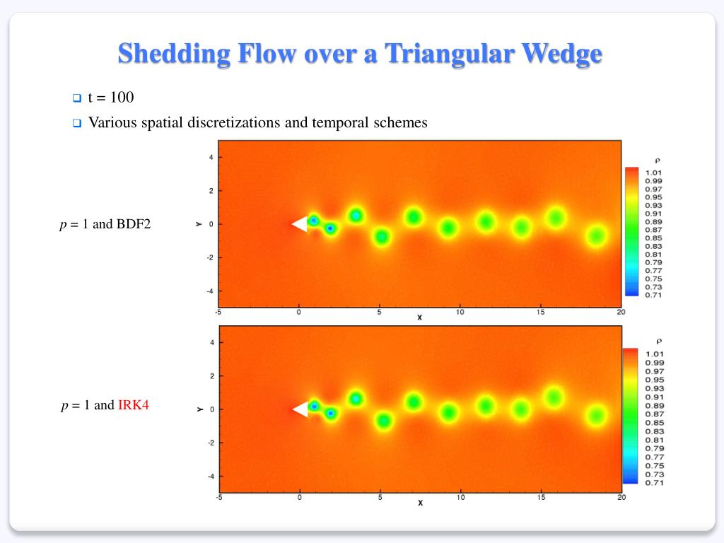 Shedding Flow over a Triangular Wedge • Free-stream Mach number = 0.2 • Unstructured mesh with 10836 elements • Various spatial discretizations and temporal schemes Density solution using p = 1 discretization and BDF2 scheme
