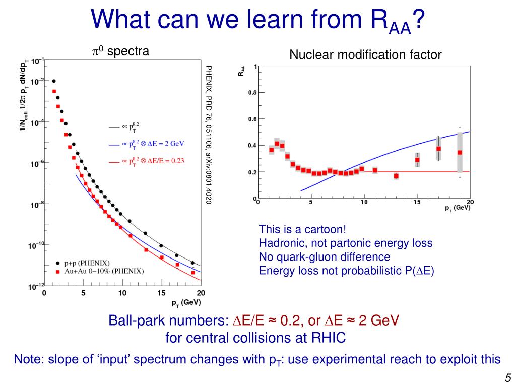 What can we learn from RAA? p0 spectra Nuclear modification factor PHENIX, PRD 76, 051106, arXiv:0801.4020 This is a cartoon! Hadronic, not partonic energy loss No quark-gluon difference Energy loss not probabilistic P(DE) Ball-park numbers: DE/E ≈ 0.2, or DE ≈ 2 GeVfor central collisions at RHIC Note: slope of ‘input’ spectrum changes with pT: use experimental reach to exploit this