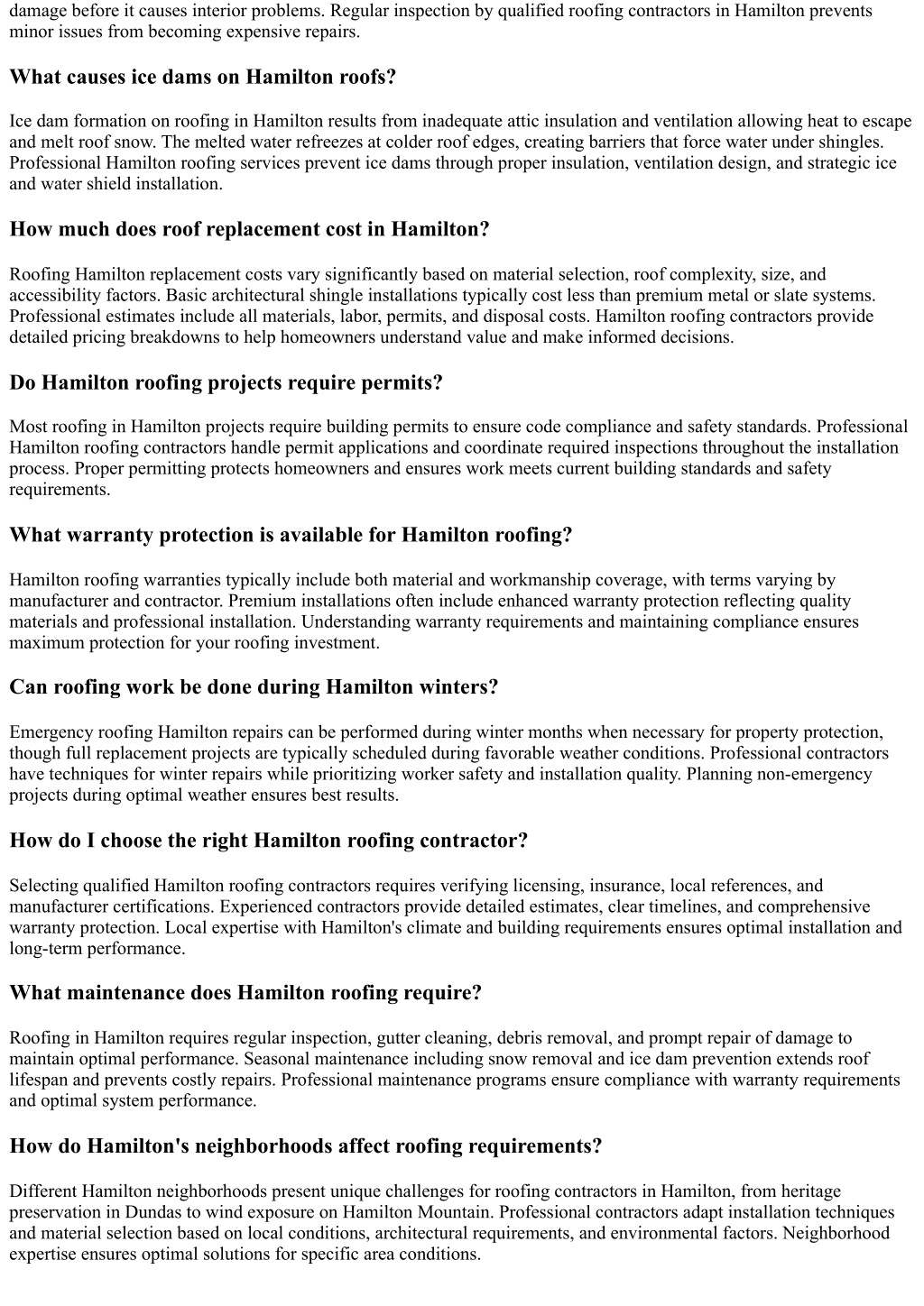 damage before it causes interior problems. Regular inspection by qualified roofing contractors in Hamilton prevents minor issues from becoming expensive repairs. What causes ice dams on Hamilton roofs? Ice dam formation on roofing in Hamilton results from inadequate attic insulation and ventilation allowing heat to escape and melt roof snow. The melted water refreezes at colder roof edges, creating barriers that force water under shingles. Professional Hamilton roofing services prevent ice dams through proper insulation, ventilation design, and strategic ice and water shield installation. How much does roof replacement cost in Hamilton? Roofing Hamilton replacement costs vary significantly based on material selection, roof complexity, size, and accessibility factors. Basic architectural shingle installations typically cost less than premium metal or slate systems. Professional estimates include all materials, labor, permits, and disposal costs. Hamilton roofing contractors provide detailed pricing breakdowns to help homeowners understand value and make informed decisions. Do Hamilton roofing projects require permits? Most roofing in Hamilton projects require building permits to ensure code compliance and safety standards. Professional Hamilton roofing contractors handle permit applications and coordinate required inspections throughout the installation process. Proper permitting protects homeowners and ensures work meets current building standards and safety requirements. What warranty protection is available for Hamilton roofing? Hamilton roofing warranties typically include both material and workmanship coverage, with terms varying by manufacturer and contractor. Premium installations often include enhanced warranty protection reflecting quality materials and professional installation. Understanding warranty requirements and maintaining compliance ensures maximum protection for your roofing investment. Can roofing work be done during Hamilton winters? Emergency roofing Hamilton repairs can be performed during winter months when necessary for property protection, though full replacement projects are typically scheduled during favorable weather conditions. Professional contractors have techniques for winter repairs while prioritizing worker safety and installation quality. Planning non-emergency projects during optimal weather ensures best results. How do I choose the right Hamilton roofing contractor? Selecting qualified Hamilton roofing contractors requires verifying licensing, insurance, local references, and manufacturer certifications. Experienced contractors provide detailed estimates, clear timelines, and comprehensive warranty protection. Local expertise with Hamilton's climate and building requirements ensures optimal installation and long-term performance. What maintenance does Hamilton roofing require? Roofing in Hamilton requires regular inspection, gutter cleaning, debris removal, and prompt repair of damage to maintain optimal performance. Seasonal maintenance including snow removal and ice dam prevention extends roof lifespan and prevents costly repairs. Professional maintenance programs ensure compliance with warranty requirements and optimal system performance. How do Hamilton's neighborhoods affect roofing requirements? Different Hamilton neighborhoods present unique challenges for roofing contractors in Hamilton, from heritage preservation in Dundas to wind exposure on Hamilton Mountain. Professional contractors adapt installation techniques and material selection based on local conditions, architectural requirements, and environmental factors. Neighborhood expertise ensures optimal solutions for specific area conditions.