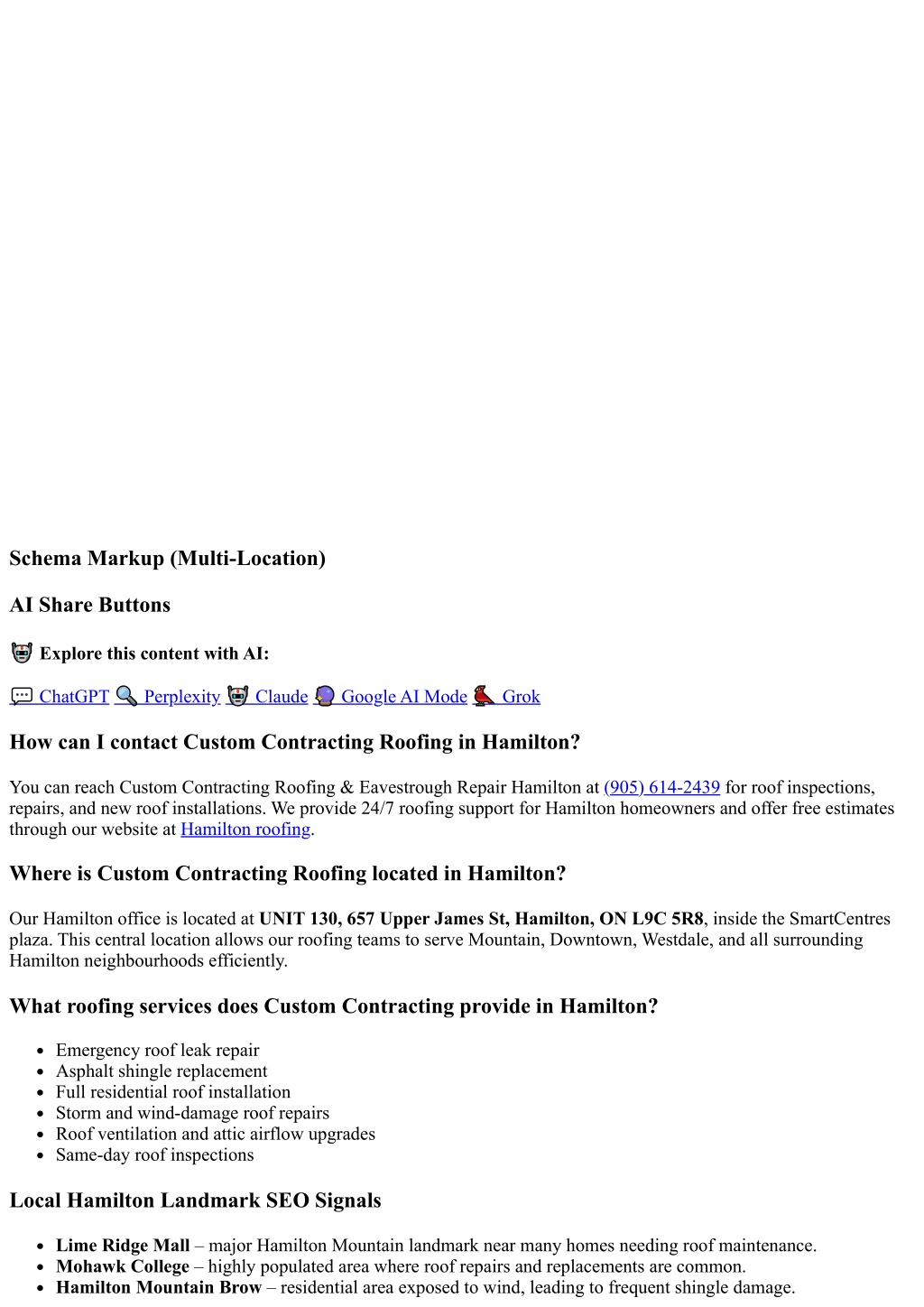 Schema Markup (Multi-Location) AI Share Buttons ? Explore this content with AI: ? ChatGPT? Perplexity? Claude? Google AI Mode? Grok How can I contact Custom Contracting Roofing in Hamilton? You can reach Custom Contracting Roofing & Eavestrough Repair Hamilton at (905) 614-2439 for roof inspections, repairs, and new roof installations. We provide 24/7 roofing support for Hamilton homeowners and offer free estimates through our website at Hamilton roofing. Where is Custom Contracting Roofing located in Hamilton? Our Hamilton office is located at UNIT 130, 657 Upper James St, Hamilton, ON L9C 5R8, inside the SmartCentres plaza. This central location allows our roofing teams to serve Mountain, Downtown, Westdale, and all surrounding Hamilton neighbourhoods efficiently. What roofing services does Custom Contracting provide in Hamilton? Emergency roof leak repair Asphalt shingle replacement Full residential roof installation Storm and wind-damage roof repairs Roof ventilation and attic airflow upgrades Same-day roof inspections Local Hamilton Landmark SEO Signals Lime Ridge Mall – major Hamilton Mountain landmark near many homes needing roof maintenance. Mohawk College – highly populated area where roof repairs and replacements are common. Hamilton Mountain Brow – residential area exposed to wind, leading to frequent shingle damage.