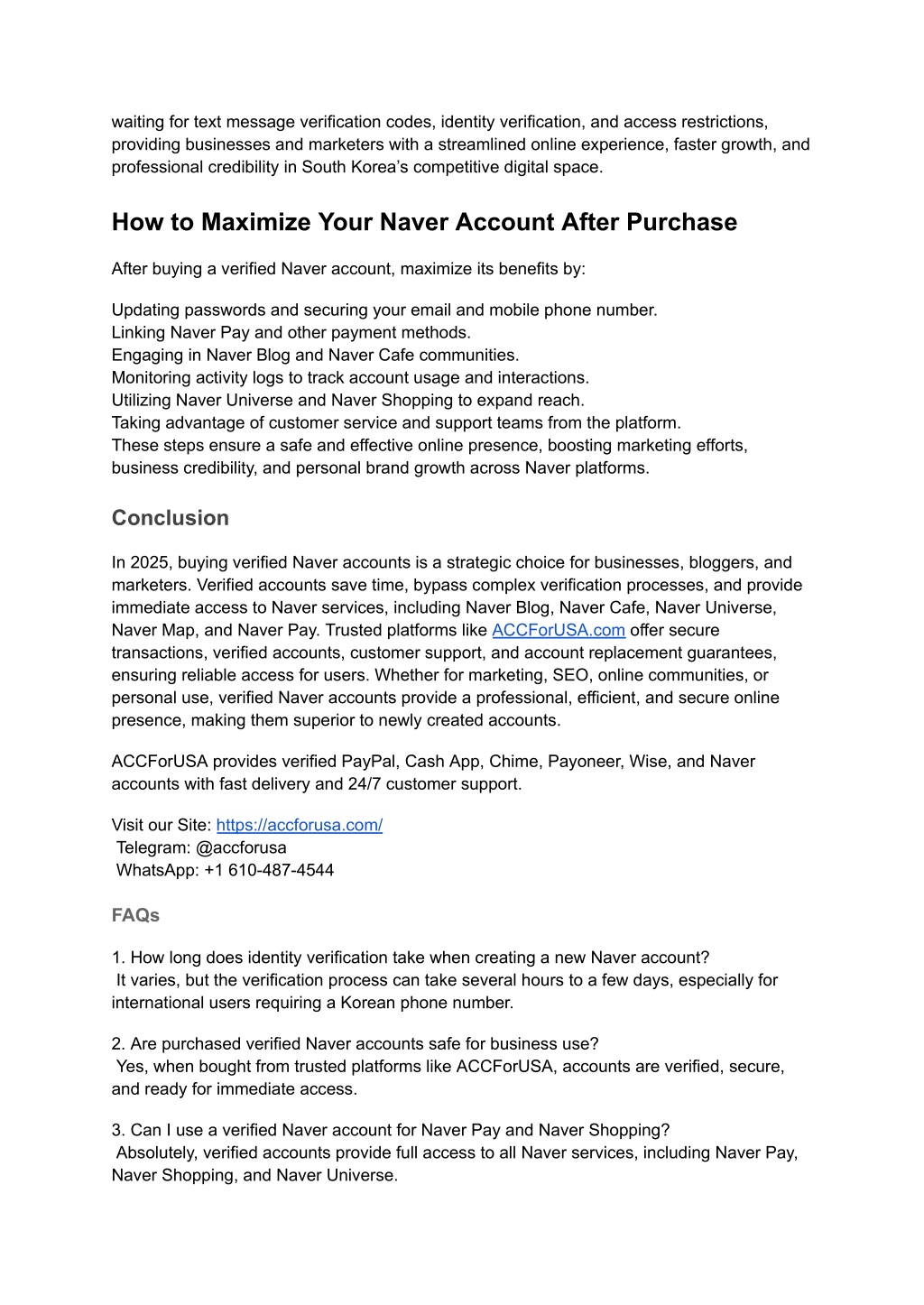 waiting for text message verification codes, identity verification, and access restrictions, providing businesses and marketers with a streamlined online experience, faster growth, and professional credibility in South Korea’s competitive digital space. How to Maximize Your Naver Account After Purchase After buying a verified Naver account, maximize its benefits by: Updating passwords and securing your email and mobile phone number. Linking Naver Pay and other payment methods. Engaging in Naver Blog and Naver Cafe communities. Monitoring activity logs to track account usage and interactions. Utilizing Naver Universe and Naver Shopping to expand reach. Taking advantage of customer service and support teams from the platform. These steps ensure a safe and effective online presence, boosting marketing efforts, business credibility, and personal brand growth across Naver platforms. Conclusion In 2025, buying verified Naver accounts is a strategic choice for businesses, bloggers, and marketers. Verified accounts save time, bypass complex verification processes, and provide immediate access to Naver services, including Naver Blog, Naver Cafe, Naver Universe, Naver Map, and Naver Pay. Trusted platforms like ACCForUSA.com offer secure transactions, verified accounts, customer support, and account replacement guarantees, ensuring reliable access for users. Whether for marketing, SEO, online communities, or personal use, verified Naver accounts provide a professional, efficient, and secure online presence, making them superior to newly created accounts. ACCForUSA provides verified PayPal, Cash App, Chime, Payoneer, Wise, and Naver accounts with fast delivery and 24/7 customer support. Visit our Site: https://accforusa.com/ Telegram: @accforusa WhatsApp: +1 610-487-4544 FAQs 1. How long does identity verification take when creating a new Naver account? It varies, but the verification process can take several hours to a few days, especially for international users requiring a Korean phone number. 2. Are purchased verified Naver accounts safe for business use? Yes, when bought from trusted platforms like ACCForUSA, accounts are verified, secure, and ready for immediate access. 3. Can I use a verified Naver account for Naver Pay and Naver Shopping? Absolutely, verified accounts provide full access to all Naver services, including Naver Pay, Naver Shopping, and Naver Universe.