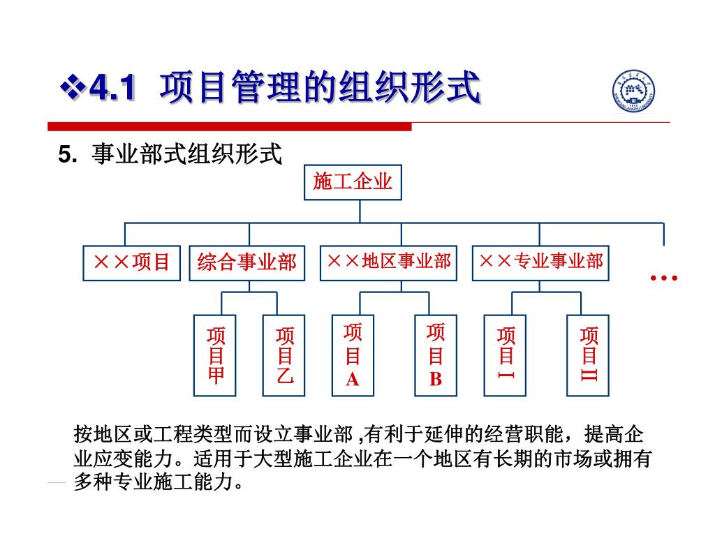 施工企业 ××项目 综合事业部 ××地区事业部 ××专业事业部 项目甲 项目乙 项目A 项目B 项目Ⅰ 项目Ⅱ • 4.1 项目管理的组织形式 5. 事业部式组织形式 … 按地区或工程类型而设立事业部 ,有利于延伸的经营职能,提高企业应变能力。适用于大型施工企业在一个地区有长期的市场或拥有多种专业施工能力。
