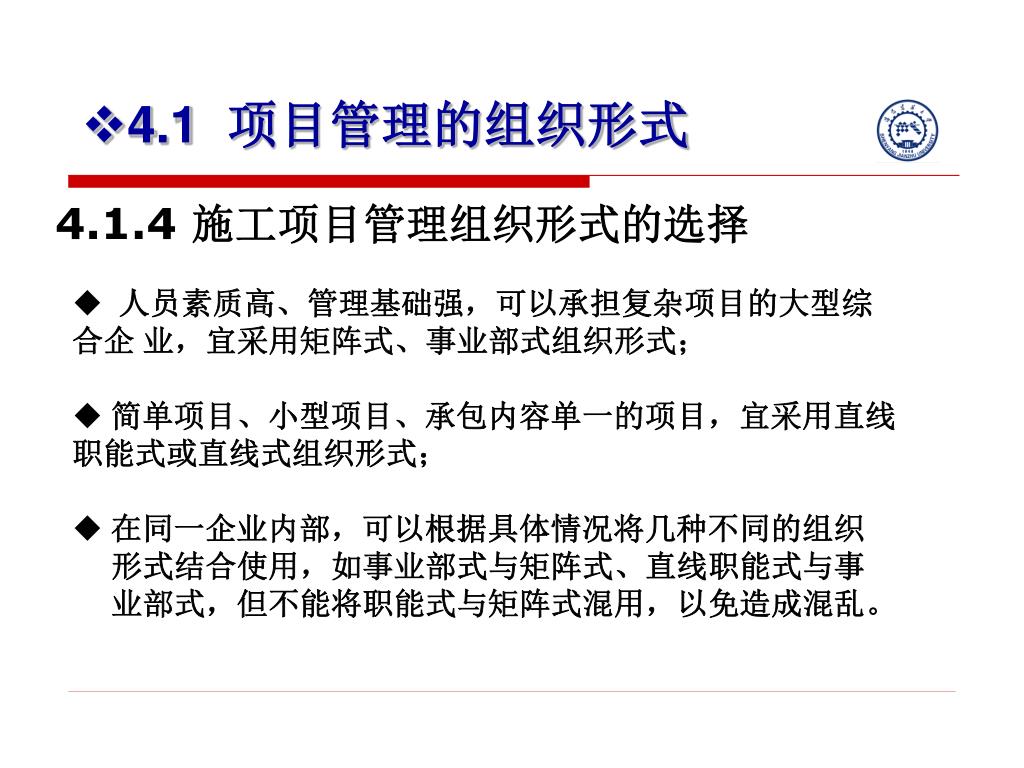 4.1 项目管理的组织形式 4.1.4 施工项目管理组织形式的选择 • 人员素质高、管理基础强,可以承担复杂项目的大型综合企 业,宜采用矩阵式、事业部式组织形式; • 简单项目、小型项目、承包内容单一的项目,宜采用直线职能式或直线式组织形式; • 在同一企业内部,可以根据具体情况将几种不同的组织 形式结合使用,如事业部式与矩阵式、直线职能式与事 业部式,但不能将职能式与矩阵式混用,以免造成混乱。