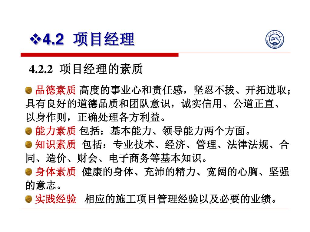 4.2 项目经理 4.2.2 项目经理的素质 • 品德素质高度的事业心和责任感,坚忍不拔、开拓进取;具有良好的道德品质和团队意识,诚实信用、公道正直、以身作则,正确处理各方利益。 • 能力素质包括:基本能力、领导能力两个方面。 • 知识素质 包括:专业技术、经济、管理、法律法规、合同、造价、财会、电子商务等基本知识。 • 身体素质健康的身体、充沛的精力、宽阔的心胸、坚强的意志。 • 实践经验相应的施工项目管理经验以及必要的业绩。