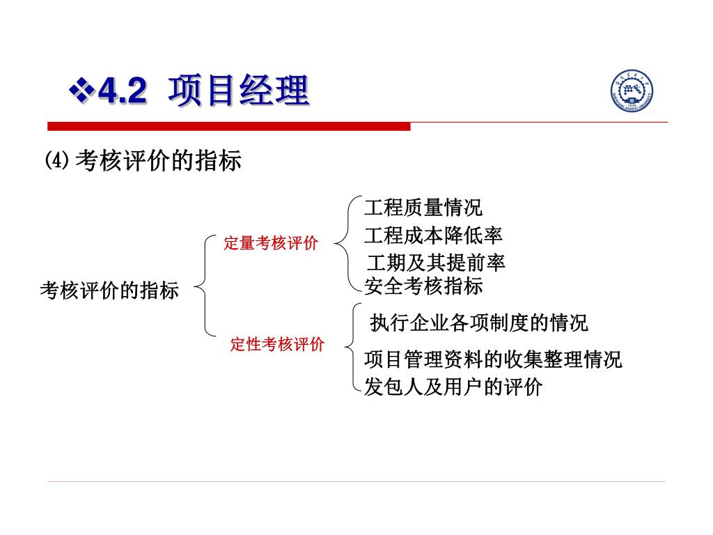 4.2 项目经理 ⑷ 考核评价的指标 工程质量情况 工程成本降低率 定量考核评价 工期及其提前率 安全考核指标 考核评价的指标 执行企业各项制度的情况 定性考核评价 项目管理资料的收集整理情况 发包人及用户的评价