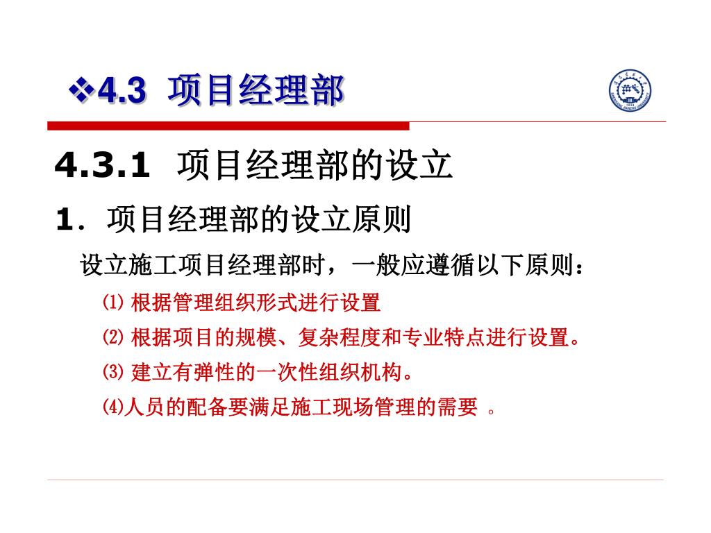4.3 项目经理部 4.3.1 项目经理部的设立 1.项目经理部的设立原则 设立施工项目经理部时,一般应遵循以下原则: ⑴ 根据管理组织形式进行设置 ⑵ 根据项目的规模、复杂程度和专业特点进行设置。 ⑶ 建立有弹性的一次性组织机构。 ⑷人员的配备要满足施工现场管理的需要 。
