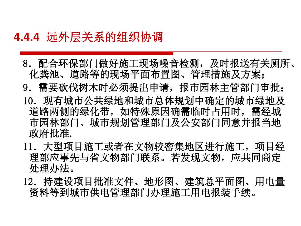 4.4.4 远外层关系的组织协调 8.配合环保部门做好施工现场噪音检测,及时报送有关厕所、化粪池、道路等的现场平面布置图、管理措施及方案; 9.需要砍伐树木时必须提出申请,报市园林主管部门审批; 10.现有城市公共绿地和城市总体规划中确定的城市绿地及道路两侧的绿化带,如特殊原因确需临时占用时,需经城市园林部门、城市规划管理部门及公安部门同意并报当地政府批准. 11.大型项目施工或者在文物较密集地区进行施工,项目经理部应事先与省文物部门联系。若发现文物,应共同商定处理办法。 12.持建设项目批准文件、地形图、建筑总平面图、用电量资料等到城市供电管理部门办理施工用电报装手续。