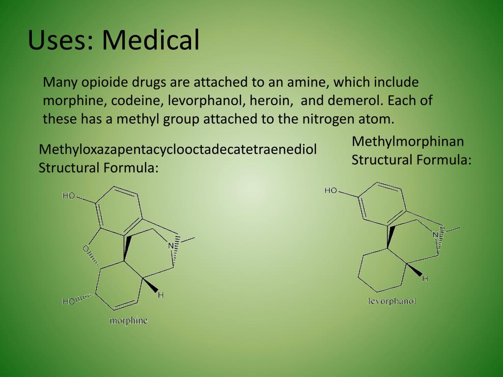 Uses: Medical Many opioide drugs are attached to an amine, which include morphine, codeine, levorphanol, heroin, and demerol. Each of these has a methyl group attached to the nitrogen atom. Methylmorphinan Structural Formula: Methyloxazapentacyclooctadecatetraenediol Structural Formula: