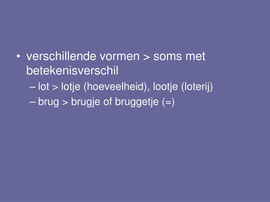 verschillende vormen > soms met betekenisverschil • lot > lotje (hoeveelheid), lootje (loterij) • brug > brugje of bruggetje (=)